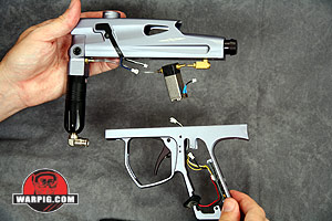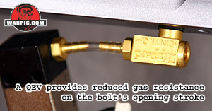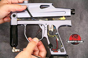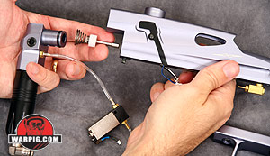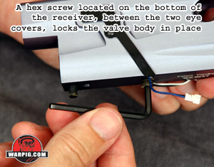 With the receiver free of the grip frame the hose between the solenoid valve and the QEV can be unplugged from either end. Then a small hex-head screw can be removed from the bottom front of the receiver to unlock the front block.