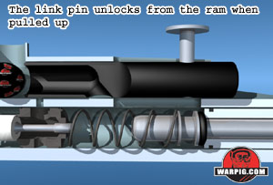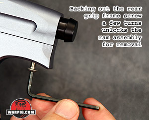 After a few turns, the rear screw will have backed out of the ram housing. The complete ram assembly and mainspring can be removed out the back of the receiver at this point.