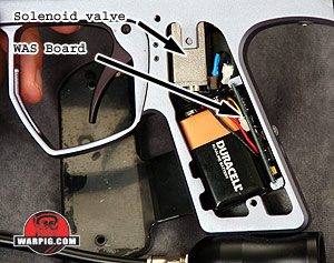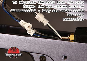 The 9-volt battery can be removed from the grip frame and unplugged from its connector.