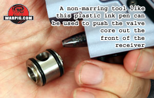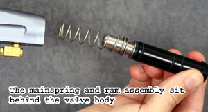 Assembly is achieved in the reverse order. The valve must be inserted, and pushed into place, being careful that its larger face is towards the front, and the smaller of its two side holes lines up with the screw hole in the bottom of the receiver, where its lock screw secures it. Continue to Testing |