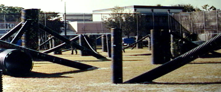 The Brass Eagle Hyperball court. In the background are the stores of "Old Town".
